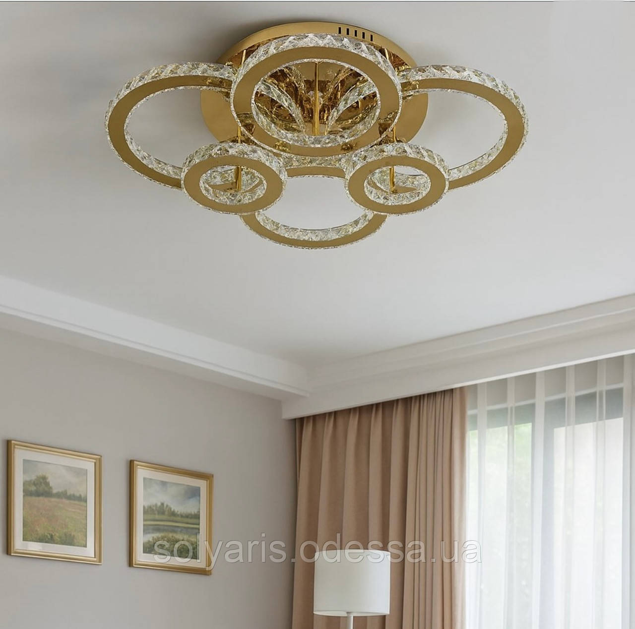 Кришталева світлодіодна люстра з пультом Колір: золото діаметр основи: 50 см ширина: 80 см довжина: 62 см висота: 21 см потужність: 200 Ватт Площа освітлення 25-30 кв. |